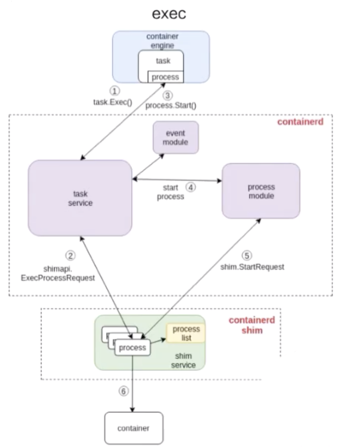 由上图可以看到,exec 的操作还是发给 containerd-shim 的。对容器来说,去 start 一个容器和去 exec 一个容器,其实并没有本质的区别。