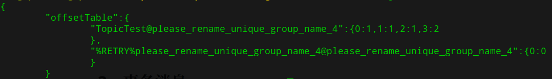 集群模式下,消息消费进度存储在 Broker 端,${ROCKETMQ_HOME}/store/config/consumerOffset.json 是其具体的存储文件,其中内容截图如下: