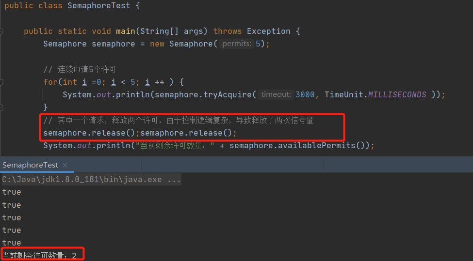 上述的场景较为紧张,如果 doSomething 是一个异步方法,则上述代码的效果会大打折扣,甚至于如果 doSomething 分支众多,而且有可能会再次异步,信号量的归还就变得非常复杂,信号量的使用最关键是申请一个许可,就必须只调用一次 release,如果多次调用 release,则会造成应用程序实际的并发数量超过设置的许可,请看如下测试代码: