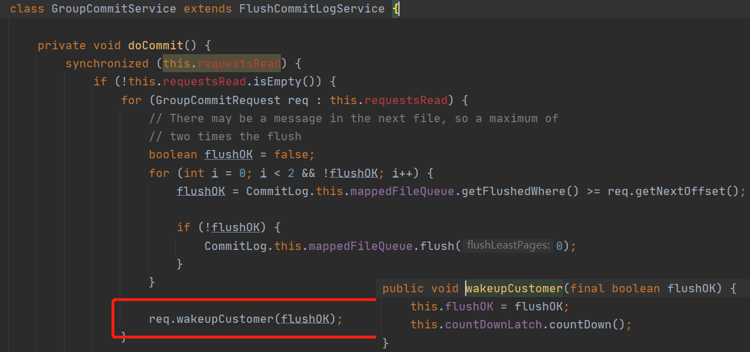 巧妙的使用 CountDownLatch 的 await 方法,进行指定超时等待时间,那什么时候会被唤醒呢?当然是刷盘操作结束,由刷盘线程来调用 countDownLatch 的 countDown() 方法,从而使 await 方法结束阻塞,其实现很简单。