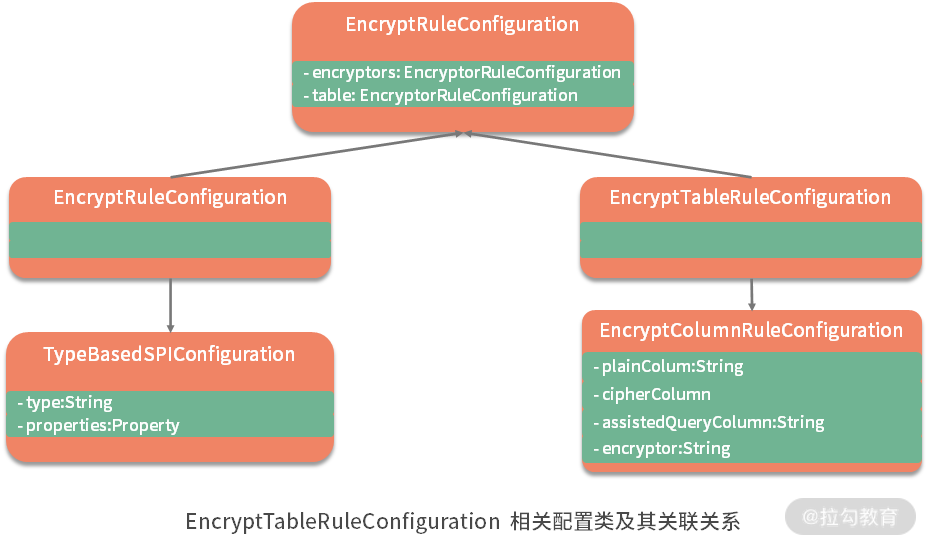 其中 EncryptorRuleConfiguration 集成了 ShardingSphere 中的一个通用抽象类 TypeBasedSPIConfiguration,包含了 type 和 properties 这两个字段: