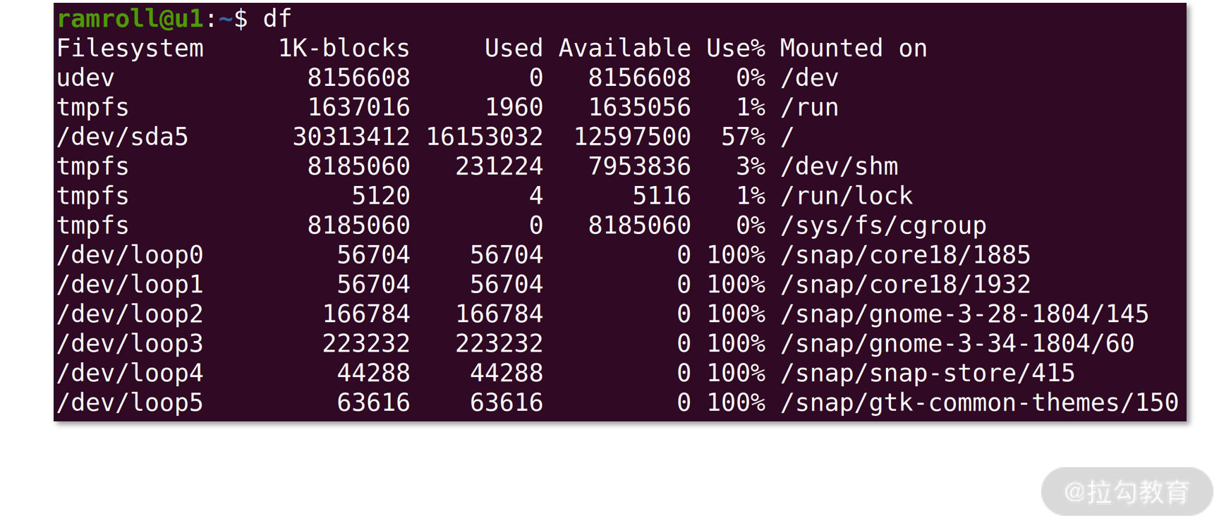 其实 df 是按照挂载的文件系统计算空间。图中每一个条目都是一个文件系统。有的文件系统直接挂在了一个磁盘上,比如图中的/dev/sda5挂在了/上,因此这样可以看到各个磁盘的使用情况。