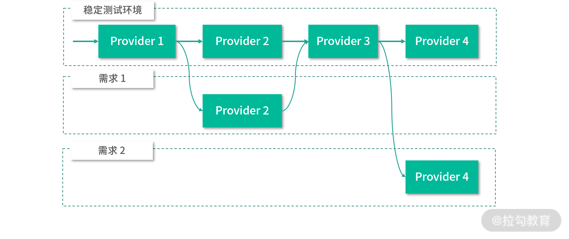 在实际的开发测试中,一个完整的请求会涉及非常多的 Provider,分属不同团队进行维护,这些团队每天都会处理不同的需求,并在其负责的 Provider 服务中进行修改,如果所有团队都使用一套测试环境,那么测试环境就会变得很不稳定。如下图所示,4 个 Provider 分属不同的团队管理,Provider 2 和 Provider 4 在测试环境测试,部署了有 Bug 的版本,这样就会导致整个测试环境无法正常处理请求,在这样一个不稳定的测试环境中排查 Bug 是非常困难的,因为可能排查到最后,发现是别人的 Bug。