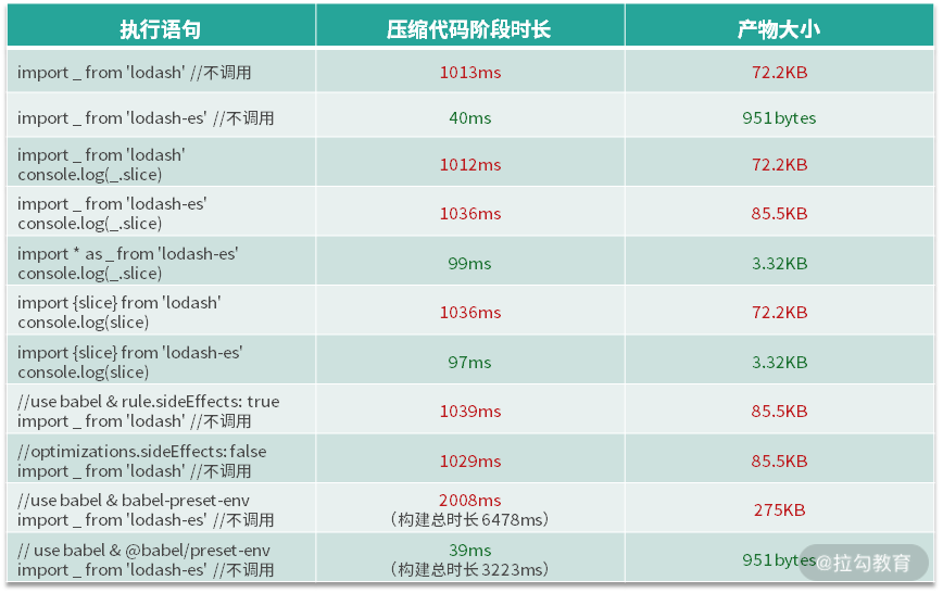 可以看到,引入不同的依赖包(lodash vs lodash-es)、不同的引入方式,以及是否使用 babel 等,都会对 Tree Shaking 的效果产生影响。下面我们就来分析具体原因。