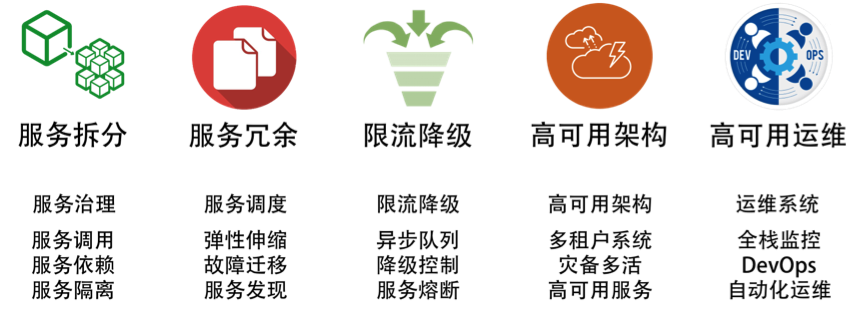 • 高可用架构,通常来说是从冗余架构的角度来保障可用性。比如,多租户隔离,灾备多活,或是数据可以在其中复制保持一致性的集群。总之,就是为了不出单点故障。