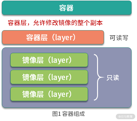 容器是基于镜像创建的可运行实例,并且单独存在,一个镜像可以创建出多个容器。运行容器化环境时,实际上是在容器内部创建该文件系统的读写副本。 这将添加一个容器层,该层允许修改镜像的整个副本。如图 1 所示。