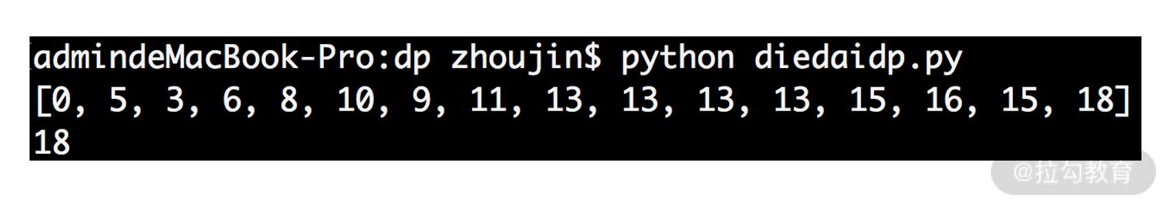 基于这段代码,我们运行的结果如下图所示,也是 18,这与我们手算的答案一致。