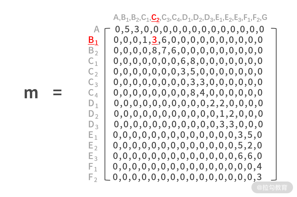 每个元素的数值的含义是两个结点的距离消耗,例如红色的 3 代表 B1 到 C2 的消耗为 3。如果数值为 0,则认为两个结点之间不可抵达。