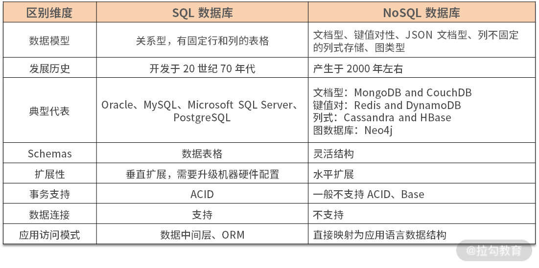 那么 NoSQL 数据库与 SQL 数据库的区别表现在哪呢?如下表所示。