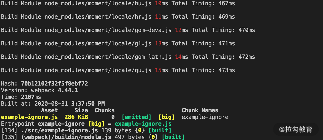 但对于大多数情况而言,项目中只需要引入本国语言包即可。而 Webpack 提供的 IgnorePlugin 即可在构建模块时直接剔除那些需要被排除的模块,从而提升构建模块的速度,并减少产物体积,如下面的图片所示。