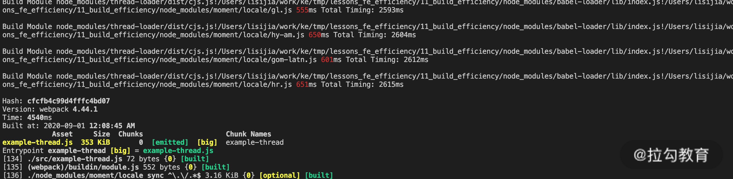 这两种工具的本质作用相同,都作用于模块编译的 Loader 上,用于在特定 Loader 的编译过程中,以开启多进程的方式加速编译。HappyPack 诞生较早,而 thread-loader 参照它的效果实现了更符合 Webpack 中 Loader 的编写方式。下面就以 thread-loader 为例,来看下应用前后的构建时长对比,如下面的两张图所示。