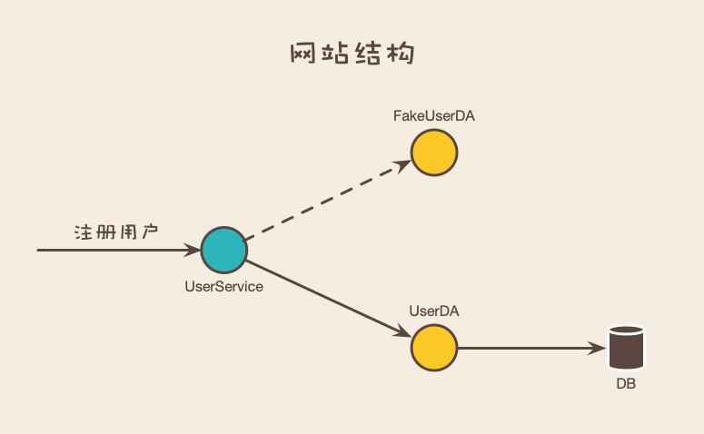 假设我们有一个网站,是基于三层架构(如下图所示),业务逻辑层的类叫 UserService 类,数据访问层的类叫 UserDA,我们将以用户注册的功能来说明几种测试的区别 。