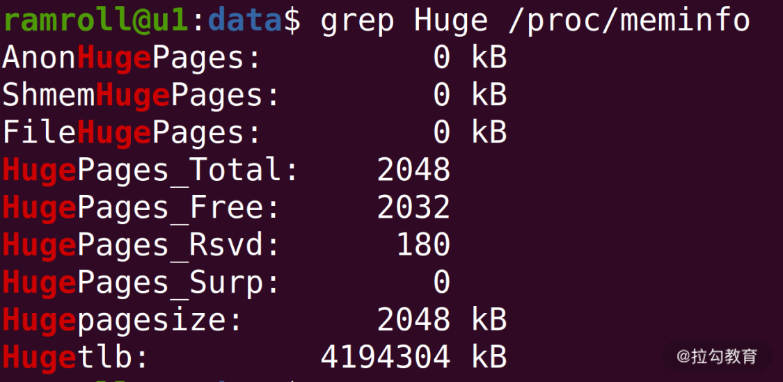 sysctl其实就是修改一下配置项,上面我们允许应用使用最多 2048 个大内存页。上面语句执行后,你可以按照下方截图的方式去查看自己大内存页表使用的情况。