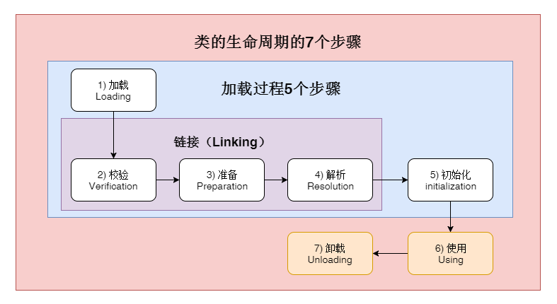 一个类在 JVM 里的生命周期有 7 个阶段,分别是加载(Loading)、验证(Verification)、准备(Preparation)、解析(Resolution)、初始化(Initialization)、使用(Using)、卸载(Unloading)。