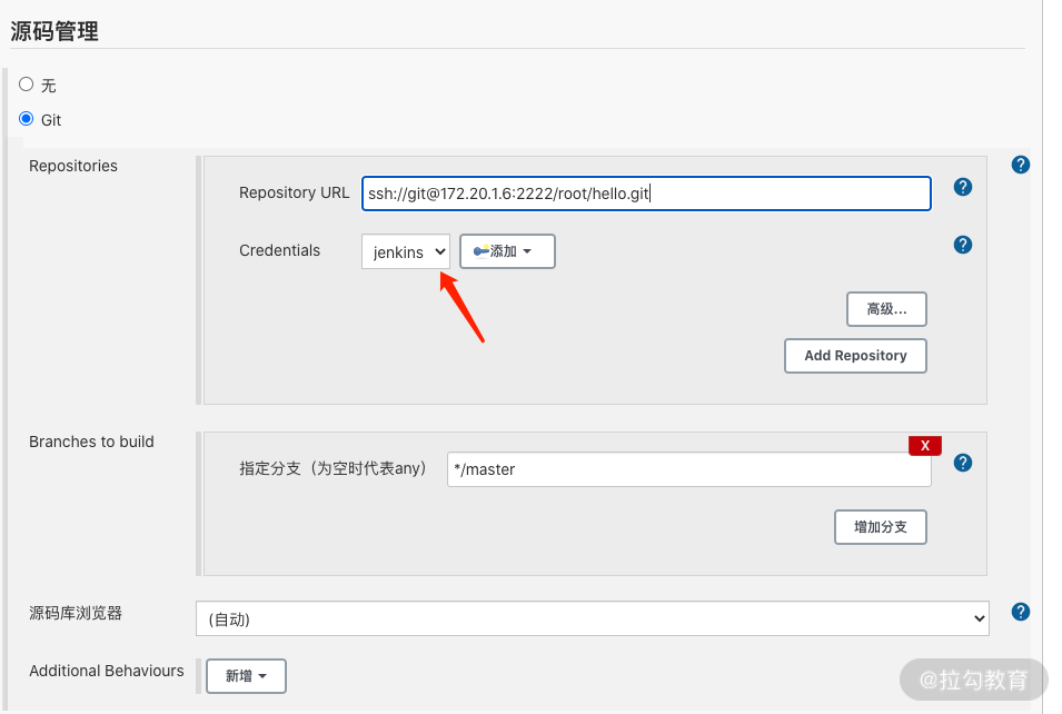 添加完成后,认证名称选择 jenkins 后,红色报错提示就会消失。这证明此时 Jenkins 和 GitLab 已经认证成功,可以成功从 GitLab 拉取代码了。