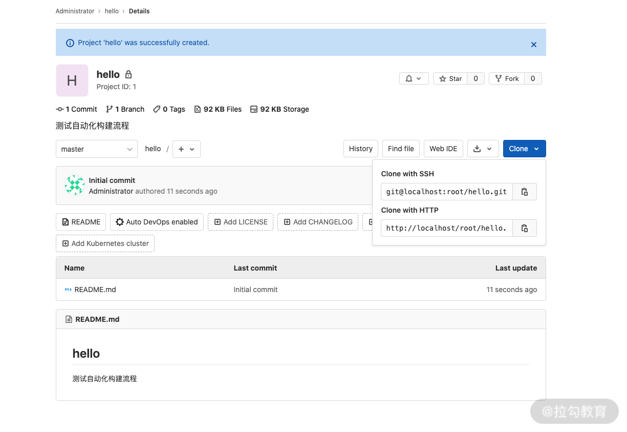 然后,我们在 GitLab 上创建一个 hello 项目,并将代码上传。