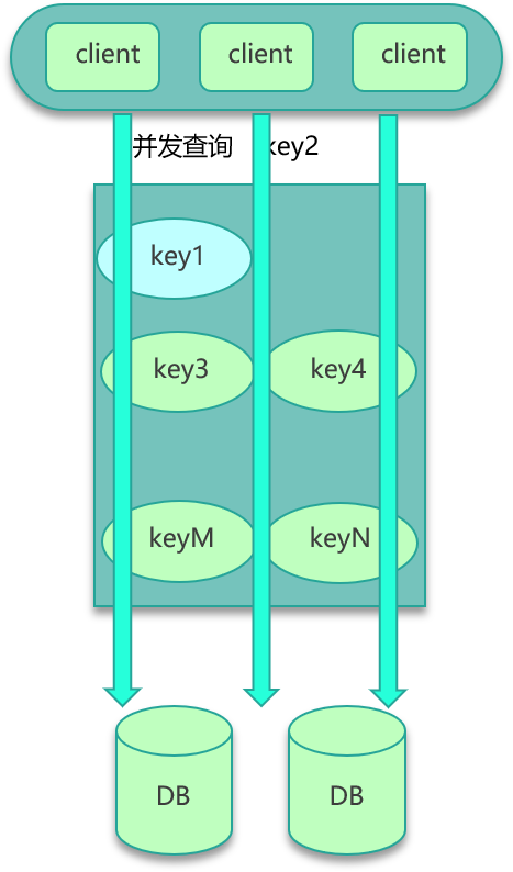 数据并发竞争,主要是由于多个进程/线程中,有大量并发请求获取相同的数据,而这个数据 key 因为正好过期、被剔除等各种原因在缓存中不存在,这些进程/线程之间没有任何协调,然后一起并发查询 DB,请求那个相同的 key,最终导致 DB 压力大增,如下图。