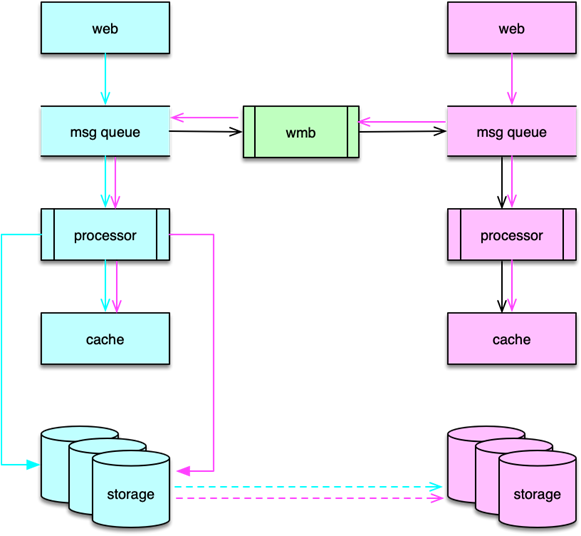 RedisService 中的数据存储在多个区域,每个区域都有多个 IDC。部署方式是核心内网加公有云的方式。使用公有云,主要是由微博的业务特点决定的,在突发事件或热点事件发生时,很容易形成流量洪峰,读写 TPS 大幅增加,利用公有云可以快速、低成本的扩展系统,大幅增加系统处理能力。根据业务特点,wredis 被分为缓存和存储类型。对于 Redis 缓存主要通过消息总线进行驱动更新,而对于 Redis 存储则采用主从复制更新。更新方式不同,主要是因为 Redis 作为缓存类型的业务数据,在不同区或者不同 IDC 的热点数据不同,如果采用主从复制,部署从库的 IDC,会出现热数据无法进入缓存,同时冷数据无法淘汰的问题,因为从库的淘汰也要依赖主库进行。而对于 Redis 作存储的业务场景,由于缓存存放全量数据,直接采用主从复制进行数据一致性保障,这样最便捷。