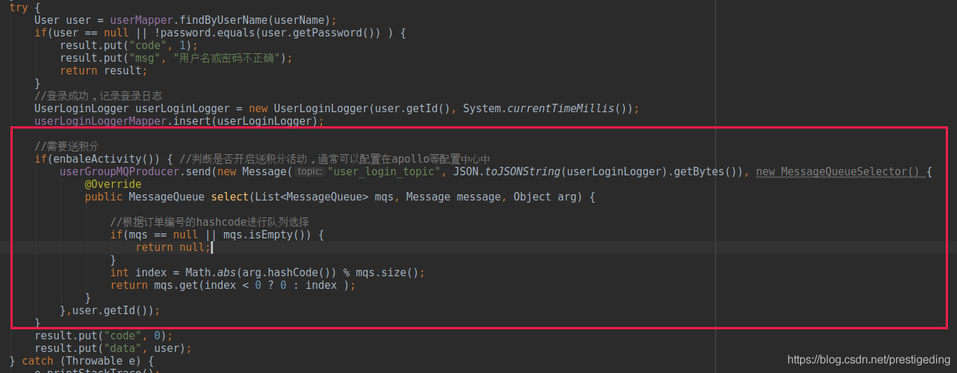 红色部分为本次送积分需求新增的代码,这种方式存在一个明显的弊端,就是会增加用户登录的耗时,因为需要调用一个积分的 RPC 服务。经分析我们可以任务用户登录操作为主流程,应该重复降低该服务的延迟,送积分这个只是一个辅助流程,完全可以将其解耦,这个时候自然而言会想到利用消息中间件来完成解耦。没错,经过改造后的代码如下图所示:
